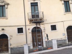 18 LUGLIO 2018 – Una scala dell’impresa di trasloco: questo è ciò che rimane della Guardia di Finanza nella palazzina che affaccia su Piazza Garibaldi e con ingresso da Via Ludovico Dorrucci. Per ragioni di sicurezza, anche questo palazzo è stato evacuato e il centro storico perde un’altra occasione di vitalità e di vivibilità. Come per diversi altri palazzi pubblici in città, si sa che sono inagibili, ma non si sa quando e come saranno riparati o, addirittura, se esistono progetto per la riparazione. In questo palazzetto soggiornò per una notte il Re di Napoli sul finire del suo Regno, alla metà dell’Ottocento; e vide una rassegna militare sconsolante il giorno dopo nella “Piazza Maggiore che, ironia della sorte, fu intitolata al conquistatore del suo regno.