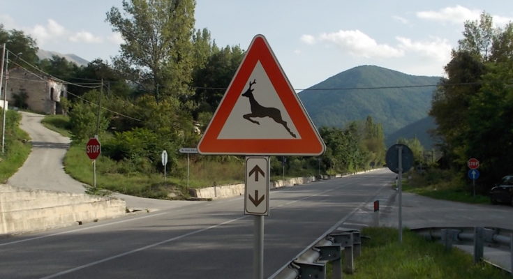 20 SETTEMBRE 2014 – Il Parco della Majella ce la mette tutta per non fare niente in quanto a tutela degli animali che si spingono da una parte del territorio di Pettorano (compreso nella perimetrazione proprio del “Parco”) e la Valle del Sagittario verso la quale naturalmente cervi, daini, lepri, volpi, lupi ed ora anche orsi si spingono per esigenze di cibo e per trovare un habitat migliore in alcune stagioni. Ma l’Anas non è da meno, visto che apporre un segnale è tutto quello che ha fatto anche dopo che la strage di animali si è infittita negli ultimi mesi e, come hanno raccontato alcuni ragazzi, solo per un soffio è stato evitato l’investimento dell’orso superstite dopo le schioppettate.Nella foto, dove si vede il breve rettilineo in corrispondenza di Ponte d’Arce;quindi, dell’innesto della Via dell’Albanese per Vallelarga e le Cavate. Sulla sinistra, alla fine della stradina in salita, si trova il gruppo di case nel quale è avvenuto l’incontro ravvicinato tra un dipendente dell’Anas (che ha un pollaio vicino casa) e l’orso poi trovato morto. A destra, a poco più di cento metri, si trova, appunto, la pista ciclabile nella quale venerdì 12 settembre alcuni passanti hanno trovato l’orso adagiato in posizione supina dopo la lunga e dolorosa agonia causata dalla peritonite per il colpo di fucile che ha raggiunto l’intestino.