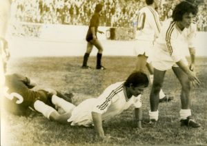 E si è rivolto a questo giornale che porta in dote un archivio fotografico di quasi 15.000 foto degli anni Settanta, tremila almeno tutte di partite di calcio. Oltre alle performances di Peppino Silenzi (nella foto insieme a Gian Carlo Tacchi che due anni dopo avrebbe giocato in serie A), abbiamo un presidente Alfonso De Deo che annoda due cravatte sul cappotto stando dietro alla porta degli avversari, con rito scaramantico che non dette risultati. Oppure i capannelli di tifosi in Piazza XX Settembre all’indomani del vile licenziamento di Dante Lacorata, con un avv. Aldo La Vella, penalista a Roma, che non disdegnò di rilasciarci una intervista per caratterizzare quello che definiva “agone sportivo”, invitando le tifoserie alla moderazione. L’”agone” – dopo che scoprimmo sul “Palazzi” cosa fosse – fu anche quello contro L’Aquila, quando sembrava che un’orda barbarica scesa dal treno e avviatasi lungo Viale della Stazione stesse per invadere lo stadio e anche marescialli della squadra politica del Commissariato, come Peppe Grassi, indossavano la divisa, dopo aver per anni operato nella discreta ombra che faceva capo ai “servizi”.