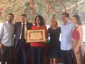 11 SETTEMBRE 2019 – Con laboriosità e impeccabile tecnica agraria Maria Assunta Palombizio e il marito Domenico D’Alessandro sono riusciti a convincere l’”Accademia della cucina” della qualità del loro aglio e la titolare dell’”Aglio D’Alessandro” ha ottenuto il diploma in una cerimonia svolta al Comune di Pratola alla presenza della consulta sulmonese dell’”Accademia”. Sfornano tonnellate di bulbi ogni anno, impegnando decine di ettari di terreno e contribuendo, quindi, a risolvere il grosso problema delle terre incolte in Valle Peligna. Ad ospitarli nell’aula consiliare del Comune di Pratola Peligna è stata la sindaca, avv. Antonella Di Nino, che nella foto vediamo insieme a Maria Assunta Palombizio e al presidente dell’”Accademia” di Sulmona, Gianni D’Amario.