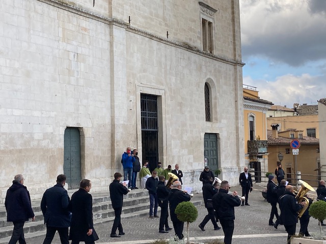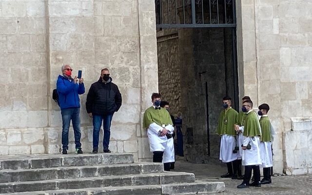 17 aprile 2022 – Prima della festa, a celebrare la festa è l’attesa. La poetica dell’attesa è il cardine del “Sabato del villaggio”. A Sulmona, poi, l’evento in sè dura pochi secondi: incomincia a correre e la statua della Madonna è già all’acquedotto, accanto a quella del figlio risorto. Così, di prima mattina gli angoli della città si animano di attesa: che non innervosisce nessuno. Almeno questi lauretani (cioè confratelli di Santa Maria di Loreto) che se ne stanno tranquilli nell’ingresso a lato del magnifico rosone. Poi la banda si avvia per svegliare il Corso e rendere omaggio davanti al Vescovado (“Al Vescovado!” annuncia un personaggio di Achille Campanile; “Al Vescovengo” risponde quello che si associa). E quando la banda si è avviata è già cominciato il preludio, che elettrizza tutti e riporta a tre anni fa, quando nessuno avvertiva l’attesa di una lunga pandemia. Per le cose brutte non c’è nè attesa, nè poetica.