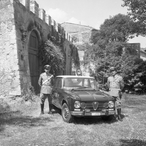 Nella foto del titolo: una “Gazzella” dei Carabinieri, comandata dal vice-brigadiere Giovanni Lasco, davanti al Castello di Gagliano Aterno, dove nella notte erano stati trafugati i quadri di scuola fiamminga appartenenti alla famiglia Lazzaroni
