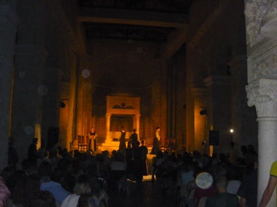 16 GIUGNO 2013 – L’uccisione dell’arcivescovo di Canterbury, oggetto dell’”Assassinio nella cattedrale” di Eliot, è stata allestita domenica a San Clemente a Casauria, nella basilica forse più raffinata dello stile romanico in Abruzzo, a meno di un tiro di schioppo dall’ insula casearia sul fiume Pescara (a sinistra una scena del dramma sull’altare).