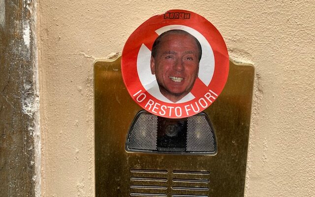 7 GENNAIO 2022 – Sulla scia del fragoroso successo della sottoscrizione contro la candidatura di Silvio Berlusconi al Quirinale, sono stati attaccati per il breve spazio di un mattino gli adesivi sul pregiudicato per reato tributario che dovrebbe insediarsi alla carica più alta della Repubblica, con il suo portato di liberismo sfrenato alla Donald Trump, l’esatto contrario di quello che una Destra sociale va sostenendo dai tempi della Carta del Carnaro, ma anche del Movimento Sociale di Almirante o della Carta di Verona. Sono immagini prese da un omaggio in uno degli ultimi numeri di “Cuore”, settimanale di oltre venti anni fa. Hanno un valore quasi… numismatico, ma, in epoca nella quale la sedicente “destra” di Salvini e quella di Meloni sono disposte a non scartare l’ipotesi del pregiudicato al Quirinale, tornano più che utili anche a Sulmona.