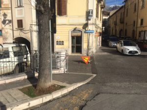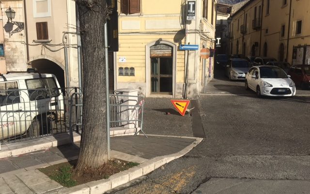 7 GENNAIO 2018 – Piuttosto che riparare il porfido divelto, forse si costruirà una rotatoria intorno al buco che da più di una settimana angustia tutti gli automobilisti in uscita da Piazza Garibaldi. Per ora resiste impavido un segnale di “pericolo generico fisso” con tanto di punto esclamativo. Alcuni, in particolare i turisti, lo interpretano come divieto di accesso a Via Marselli e vanno all’uscita opposta attraversando il Corso; qualcun altro prende a occhio le misure e passa stringendosi sulla sinistra o sulla destra.