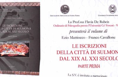 PRESENTATO IL VOLUME DALL’OTTOCENTO AD OGGI 23 DICEMBRE 2019 – Il lungo esame delle iscrizioni sedimentate nella storia di Sulmona si arricchisce di un nuovo...