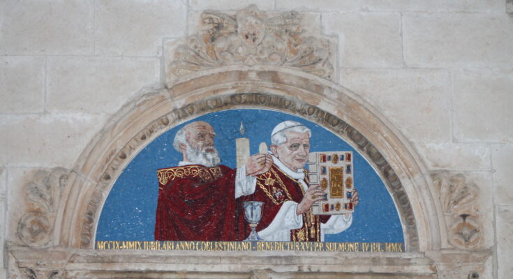 Nella foto del titolo la lunetta di un ingresso nella Cattedrale di San Panfilo che riproduce Papa Celestino V e Papa Benedetto XVI, inaugurata nella visita di Papa Ratzinger nel 2010 a Sulmona