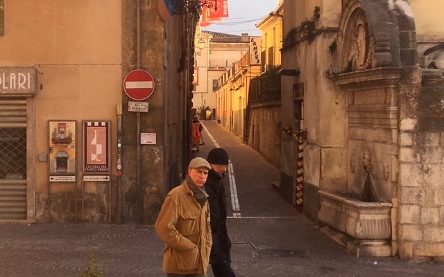 20 FEBBRAIO 2019 – I fratelli Giacomo e Marco Allega ogni mattina vengono a piedi dalla frazione Banchette per aprire il negozio in Piazza Plebiscito e, alle 13, passare al ristorante lì vicino e poi tornare al negozio; da anni, da decenni, con qualunque tempo, alla stessa ora.