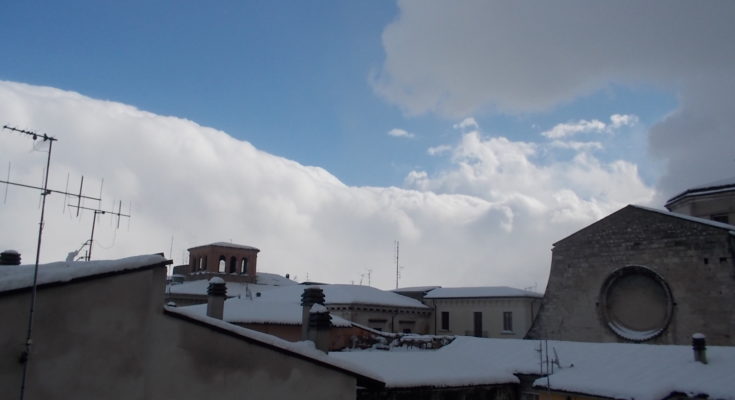 E una testimonianza di questa eccezionale condizione meteorologica si rinviene nel fronte di questa Chiesa di San Francesco della Scarpa rivolto verso nord-ovest, con lo sfondo della Majella e, in parte, del Morrone; oppure sulla cupola dell’Annunziata e sui tetti del Palazzo della Cavallerizza dei marchesi Mazara.