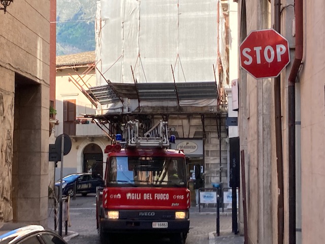 Intanto oggi pomeriggio i Vigili del Fuoco hanno cercato di intrufolarsi nel dedalo di vicoli attorno a San Gaetano con un’autoscala che era troppo grande. Poco prima c’era stato il cedimento dell’ennesimo cornicione, con tanto di deflagrazione all’angolo di Via Stella e vico Rettangolo, che è così rettangolo e stretto da consentire appena l’appoggio di una scala a libretto. Insomma, è consigliabile sentire la Protezione Civile prima di allestire balconi fioriti al centro di Sulmona, che di recente è entrato nella road map della sindaca, perché alle elezioni si possa dire che è stato non solo bonificato, ma tornato più bello e fascinoso che pria, direbbe Petrolini, seguito da Proietti.