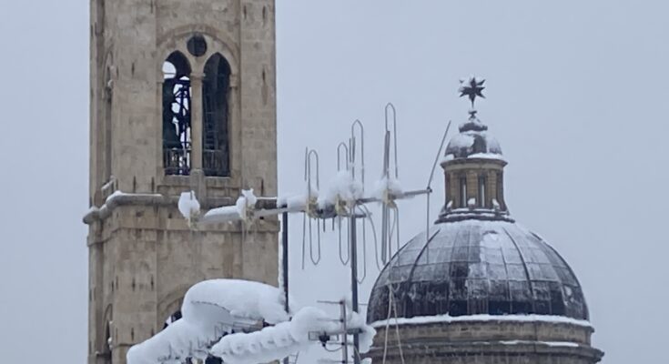 21 GENNAIO 2023 – Darà i soliti problemi per il “piano neve” che stenta a partire (rispetto a quelli della “Pastorino”), ma, prima che infierisca il giorno impietoso, decora anche campanile e cupola.