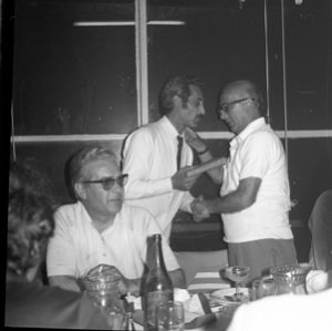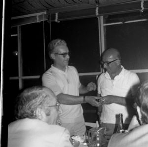 Dante Lacorata mentre saluta, all’Hotel Artù di Cosentino, l’appassionato tifoso Oreste Di Paolo, che curava una trasmissione radiofonica