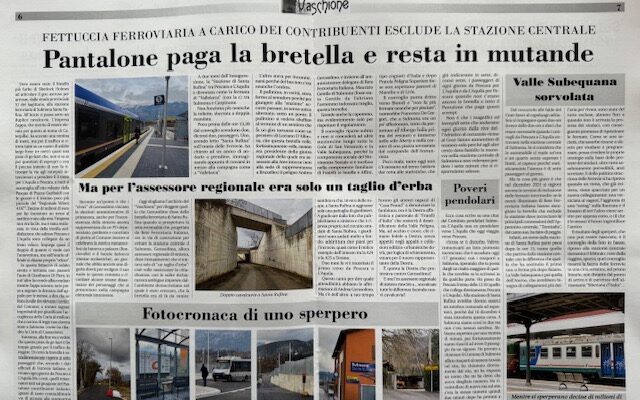 Non potevamo ignorare lo scempio di Santa Rufina, il casello adattato a simil-stazione e circondato da cinque o sei cavalcavia, a un chilometro dagli impianti della stazione centrale per un passeggero all’ora di pranzo e (forse) uno alla sera, sui due convogli nell’arco della giornata. Sono state spese decine di milioni di euro e l’impresa “Zappa” può essere promossa a “Caterpillar”, a dispetto dell’annuncio di Andrea Gerosolimo, che da assessore regionale assicurava trattarsi “solo di un taglio d’erba”, quando parlava del cantiere appena abbozzato. E’ la bretella che ha sbancato il Pantalone contribuente e lo ha lasciato in mutande, come il passeggero psicologicamente si sente, sperso nella campagna.