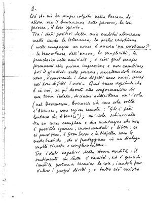 Tra i dati positivi della mia eredità abruzzese metto anche la tolleranza, la pietà cristiana (nelle campagne un uomo è ancora “nu cristiane”), – la benevolenza dell’umore, la semplicità, la franchezza nelle amicizie; e cioè quel sempre fermarmi alla prima impressione e non cambiare poi il giudizio sulle persone, accettandole come sono, riconoscendo i loro difetti come miei, anzi nei loro difetti i miei. Quel senso ospitale che è in noi, un po’ dovuto alla conformazione di una terra isolata, diciamo addirittura un’isola (nel Decamerone, Boccaccio cita una sola volta l’Abruzzo, come regione remota: “Gli è più lontano che Abruzzi”); un’isola schiacciata tra un mare esemplare e due montagne che non è possibile ignorare, monumentali e libere: se ci pensi bene, il Gran Sasso e la Majella sono le nostre basiliche, che si fronteggiano in un dialogo molto riuscito e complementare.