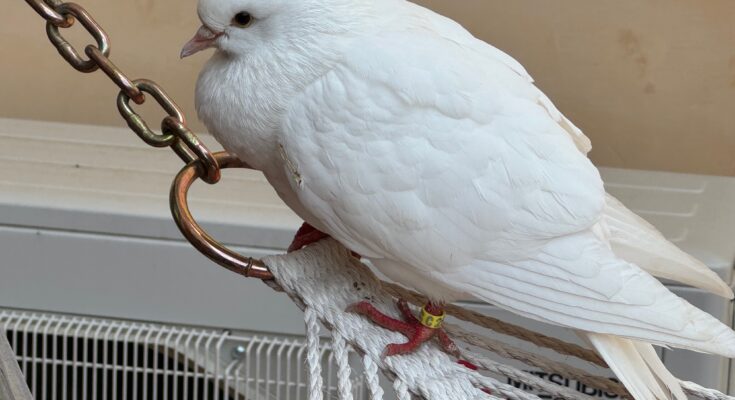 28 APRILE 2025 – Una colomba bianchissima, come quelle che l’iconografia vuole portatrici di pace, si è posata, invero poco timidamente, su un’amaca al centro della città, poco prima che esplodesse un temporale. Sguardo attento e nessuna paura degli umani: anzi, la zampa sinistra era cinta da un nastrino con alcuni numeri e lettere impresse. Da dove veniva? Da un allevamento? Da una stazione di posta, di quelle che segnavano il punto di ritorno per i messaggeri di altri tempi? Non lo sapremo mai, perchè se n’è andata senza ragioni apparenti, com’era venuta, dopo aver gradito una fetta di pane, che ha beccato senza fretta e senza perdere di vista chi gliel’ha data, forse nella speranza di ricevere anche il companatico. Può essere stata un segno di chissà quale messaggio. O forse era solo di ritorno dalla Palestina dove l’aveva mandata Papa Francesco e da dove è stata scacciata dai criminali al seguito del nazional-sionista Netanyahu.