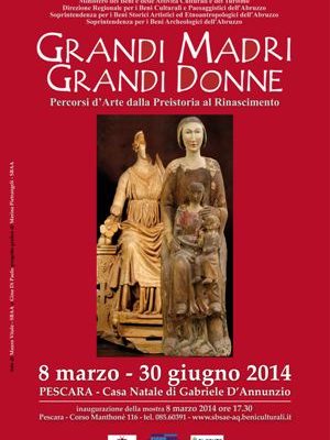 1 APRILE 2014 – Si sta tenendo a Pescara, nella Casa natale di Gabriele d’Annunzio in Corso Manthonè 116 la mostra di arte dal tema “Grandi madri grandi donne”, organizzata dalla Soprintedenza per i Beni storici, artisti ed etnoantropologici dell’Abruzzo, nonché dalla Soprintendenza per i Beni archeologici d’Abruzzo. Le opere riguardano il percorso dalla Preistoria al Rinascimento.