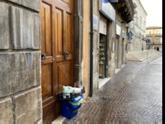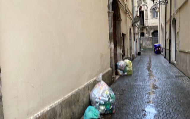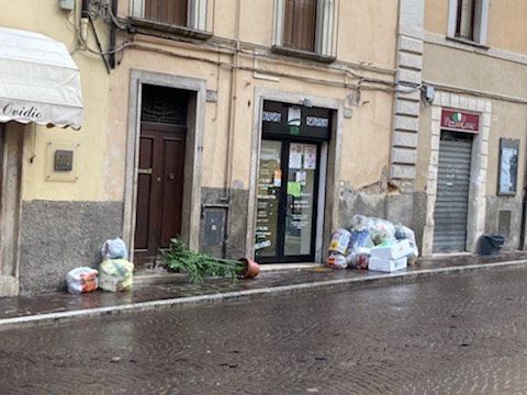2 GENNAIO 2021 – Presi dalla lettura del nuovo calendario del Cogesa, che contiene molte più notizie di “Cogesa Informa” perché se non altro è utile per sapere dei cervellotici cambiamenti nei prelievi dei mastelli, ci era sfuggita stamane l’ultima conseguenza della stravagante amministrazione nel Cogesa, già distintasi l’anno scorso di questi tempi per aver lasciato l’organico puzzare per lunghi giorni, una settimana. In questo lascito amministrativo c’è anche (a meno di smentite che possiamo sempre riportare) la predisposizione dei turni per la plastica, che a Natale non è stata raccolta e che non era in calendario in nessuno dei giorni successivi, neanche ieri, che pure era venerdì. Solo oggi l’almanacco a due facciate del Cogesa ha fissato una raccolta straordinaria, ma come sempre senza orario, cosicchè la plastica sta ancora là almeno fino alle 11: gli effetti sono quelli delle foto e di una città che nel secondo giorno dell’anno si presenta come si presenta Sulmona (celebrata città riciclona da stampa plaudente).