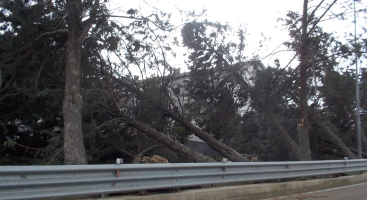 Nella foto in alto: una serie di alberi abbattuti presso il casello autostradale di Pratola Peligna. Nella foto in basso il viale di accesso al cimitero di Sulmona