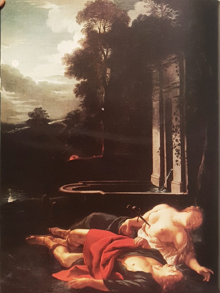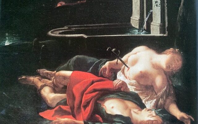 E’ un episodio che sembra aver fornito materiale a Shakespeare sull’equivoco di fondo che determina l’orribile tragedia di Romeo e Giulietta. Piramo e Tisbe (l’immagine del titolo e in basso: “Piramo e Tisbe”, Jean-Francois de Troy, olio su tela, 1708-1710 circ a, Parigi, Collezione privata) decidono di darsi appuntamento nei pressi del grande albero “tutto carico di bacche bianche come neve, un alto gelso sull’orlo di una freschissima fonte. Rimasero d’accordo così, e la luce del giorno, che sembrava non volesse più andarsene, alla fine calò nelle acque, e dalle stesse acque emerse la notte. Di soppiatto, aperta con cautela la porta, Tisbe uscì nelle tenebre senza farsi sentire dai suoi, e col volto velato arrivò al sepolcro e si sedette sotto l’albero prestabilito. L’amore la rendeva ardita. Quand’ecco che una leonessa, che aveva appena fatto strage di buoi, venne con la schiuma alla bocca ed il muso intriso di sangue a spegnere la sete nell’acqua della fonte lì accanto. Tisbe di Babilonia la vide di lontano al chiarore della luna, e con piede trepidante corse a rifugiarsi in una grotta oscura, ma mentre fuggiva il velo le scivolò dalle spalle. La feroce leonessa, sedata con molta acqua la sete, stava tornando nel bosco, quando per caso trovò il delicato velo abbandonato, e lo stracciò con le fauci insanguinate. Piramo, uscito più tardi, scorse nell’alta polvere le orme inconfondibili di una belva e sbiancò in tutto il volto, e quando poi trovò anche la veste macchiata di sangue: “Una stessa notte – disse – vedrà la fine di due innamorati. Di noi, era lei la più degna di vivere a lungo; l’anima colpevole è la mia. Sono stato io ad ucciderti, poverina, chè ti ho istigato a venire di notte in luoghi spaventosi e neppure sono arrivato per primo. Straziate il mio corpo e divorate con morsi feroci questi visceri scellerati, tutti voi leoni che abitate sotto questa rupe! Ma è da vili limitarsi a desiderare la morte”. Raccolse i brandelli del velo di Tisbe e li portò con sé ai piedi dell’albero convenuto, e come ebbe versato lacrime, come ebbe impresso baci su quella cara veste, esclamò: “Imbeviti ora anche di un fiotto del sangue mio!” E si cacciò nel ventre il pugnale che aveva al fianco, e subito, morente, lo ritrasse dalla gorgogliante ferita. Cadde a terra supino. Il sangue sprizzò in alto come quando, logoratosi il piombo, un tubo si fende e da un sottile foro esce sibilando un lungo getto d’acqua, che taglia l’aria con violenza. I frutti della pianta, spruzzati di sangue, divengono scuri, e la radice inzuppata continua a tingere di rosso cupo i grappoli di bacche. Ed ecco che lei ritorna – non si è ancora rimessa dalla paura – per non deludere l’innamorato, e con gli occhi e col cuore cerca il giovane e non vede l’ora di raccontargli a che grande pericolo è sfuggita. Ma se ritrova il posto e riconosce la forma della pianta, il colore dei frutti la fa restare incerta: non sa più se sia quella. Mentre è lì in dubbio, vede un corpo agonizzante palpitare a terra in una pozza di sangue, indietreggia, e col volto più pallido del legno di bosso rabbrividisce, come tremola il mare se debole brezza ne increspa la superficie. Ma quando, dopo un attimo, riconosce il suo amore, allora si batte con sonore percosse le braccia che non lo meritano e si straccia i capelli e abbraccia il corpo amato e riempie la ferita di lacrime e mescola il pianto al sangue, e imprimendo baci sul gelido volto grida: “Piramo, che ti è successo? Perché ti ho perduto? Piramo, rispondi! E’ la tua carissima Tisbe che ti chiama. Mi senti? Alza lo sguardo spento!” Al nome di Tisbe, Piramo levò gli occhi su cui già gravava la morte, e come l’ebbe vista li richiuse. Lei riconobbe allora la propria veste e vide la guaina d’avorio senza il pugnale, e disse : “La tua stessa mano e l’amore ti hanno ucciso, infelice! Ma anch’io ho una mano forte per questa cosa almeno: anch’io ho l’amore: sarà questo a darmi la forza di colpirmi. Ti seguirò nella morte, e si dirà che sventuratissima io sono stata la causa e la compagna della tua fine. E tu che avresti potuto essermi strappato, ahi, solo dalla morte, neppure dalla morte potrai essermi strappato. Questa preghiera tuttavia vi rivolgiamo ambedue, o infelicissimi padre mio e padre suo, di non negarci di essere composti in uno stesso sepolcro, noi che siamo stati uniti da un amore vero, che siamo stati uniti nell’estremo istante. E tu, albero che ora copri con i rami il misero corpo di uno, e presto coprirai i corpi di due, serba un segno di questa tragedia e abbi sempre i frutti cupi, come a lutto, a ricordo del sangue da due insieme versato”. Così disse, e puntatosi il pugnale sotto il petto, si curvò sulla lama che ancora era calda di sangue. La preghiera, però, raggiunse e commosse gli dei, raggiunse e commosse i genitori. E per questo il colore delle bacche, quando sono mature, è nero, e ciò che è avanzato dal rogo riposa in un’unica urna”.