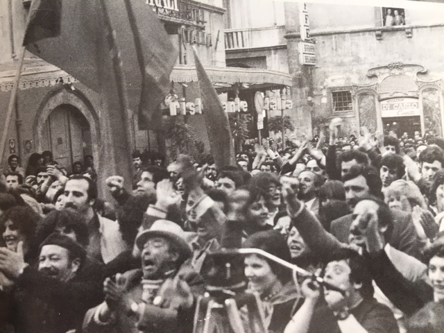 Pubblichiamo, perchè sia di buon auspicio, una foto dei tempi di massima partecipazione alle vicende sociali. Non si riconosce il colore delle bandiere perchè è in bianco e nero, ma anche domani non sarà il colore a contare.