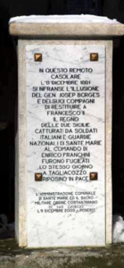La lapide che ricorda, a casale Mastroddi in Sante Marie, il luogo della cattura di Borges a pochi chilometri dai confini con lo Stato Pontificio, dove il generale era atteso da Re Francesco II