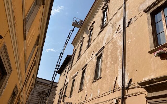 14 GIUGNO 2021 – E’ servita solo a mettere in sicurezza il tetto la giornata di lavoro in Via Carrese, sul versante est di Palazzo Mazara (nella foto la fase di primo accesso). La manutenzione completamente mancata in poco più di quattro anni ha lasciato che marcissero i sostegni del tetto del piano rialzato e almeno uno è letteralmente collassato, scaricando il peso sul muro laterale e provocato la crepa dalla quale è partito l’allarme. Prevedibilmente nei prossimi giorni sarà allestito il ponteggio che dovrebbe consentire la riparazione del tetto