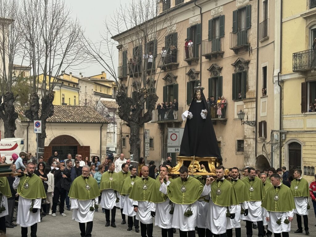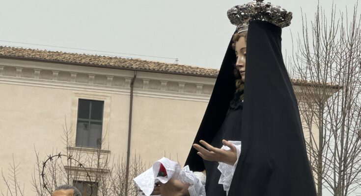 2 APRILE 2024 – E’ l’immagine di una fanciulla gravata di un ruolo molto più grande dei suoi sedici anni, quella della “Madonna che scappa in piazza” con i pesantissimi segni di un lutto per il quale tutto “consummatum est”. Quel viso da bambina che sottolinea la gioia appena dopo il nuovo incontro con il figlio, rende più ricco di contenuti umani l’altro incontro, quello terreno degli spettatori in Piazza Garibaldi prima della travolgente corsa della speranza che si trasforma in pochi secondi in certezza.