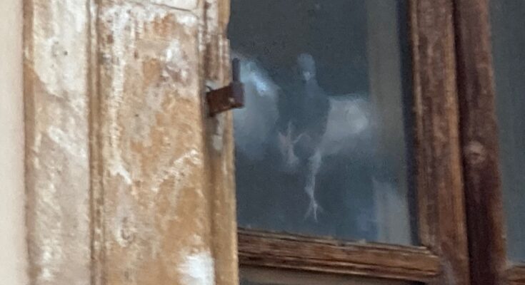 24 GIUGNO 2022 – L’incedere di questo piccione rivela una natura all’opposto di quella descritta dai poeti quando parlano di “timide colombe”. E’ una nuova genìa di volatili: quella che assale il centro storico, fatta di soggetti invadenti, chiassosi, che, al contrario di molti politici e amministratori, non la fanno fuori del vaso, perchè non ci provano neppure a contenersi nei vasi e non hanno proprio vasi che suscitino il loro interesse. Nel caso concreto, il piccione si arrampica sui vetri di una finestra. E in questo, bisogna dirlo, imita politici e amministratori.