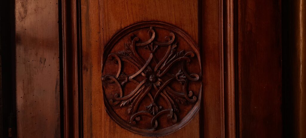Il luogo è il Palazzo Mazara, oggetto di costosi interventi di bonifica un anno e mezzo fa, dove sono conservati infissi di grande pregio, come questo intarsiato nelle sale che al primo piano erano destinate ai ricevimenti. Il Palazzo negli ultimi mesi si è ripopolato di piccioli, per la inidoneità delle tutele apprestate: addirittura tavole inchiodate per serrare le porte; rete tra il cortile superiore e quello del piano nobile, scardinata dalla neve di marzo, come le reti applicate trent’anni fa. Insomma, un convulso arrampicarsi sui vetri, finanziato da una nuova figura di General Contractor: Pantalone.