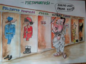 Maiorano rappresenta un Salvini che, aduso a cambiare abbigliamento per ogni tipo di evento, deve indossare la toga romana di Ovidio e si chiede se questa città si sia ridotta ad essere prona proprio verso di lui. Tra le altre pulcinellate del Ministro dell’interno, sono catalogate nelle teche quella di “ultras”, ma anche quella di pompiere, di Tarzan, di infermiere. Insomma, una continua rincorsa a sfruttare le immagini per mietere consensi, senza neppure considerare che le persone con un minimo di sale in zucca auspicherebbero una immagine unica e coerente, frutto di parole e comportamenti coerenti, più che di divise e di ammiccamenti che in genere sono attribuiti alla napoletanità, ma che (Salvini dimostra) debbono appartenere soprattutto all’ Italia del Nord.
