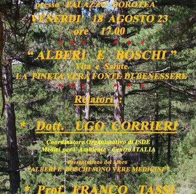 Insieme a Franco Tassi, sarà relatore Ugo Corrieri, coordinatore organizzativo di ISDE Medici per l’Ambiente (quelli che si stanno battendo per denunciare i rischi della centrale di spinta del gas in Valle Peligna). Nello stesso pomeriggio sarà presentato il libro: “Alberi e boschi sono vere medicine”.