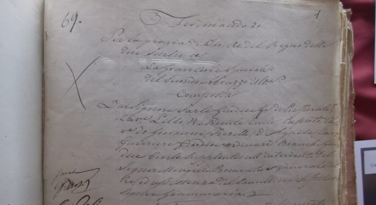 Nella foto in alto la sentenza della Corte criminale recante la condanna di Panfilo Serafini a venti anni di “ferri”; in basso alcuni corpi di reato in processi borbonici, cioè i segni del tricolore. Si possono vedere nella mostra aperta fino alla fine dell’anno all’Archivio di Stato.