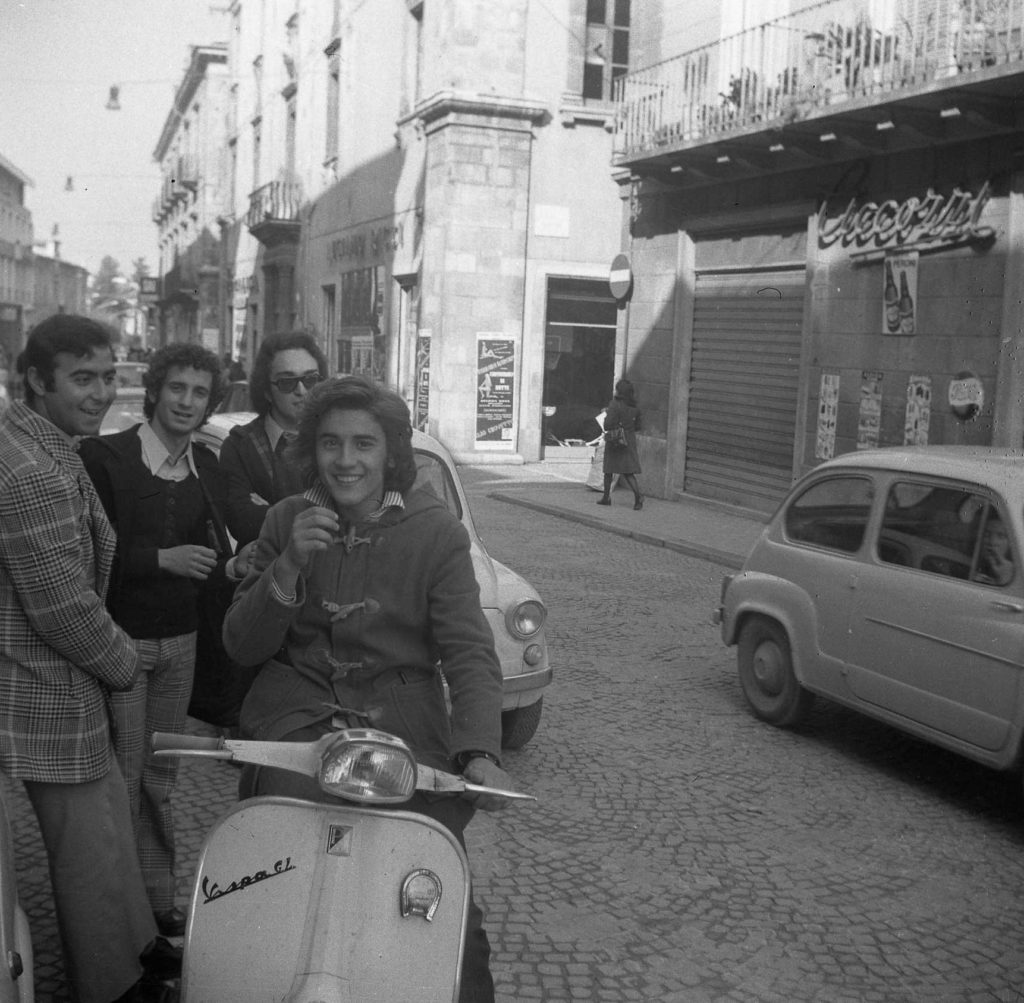 Gabriele Tedeschi nel 1972 in Vespa davanti alla redazione de “Il Tempo”