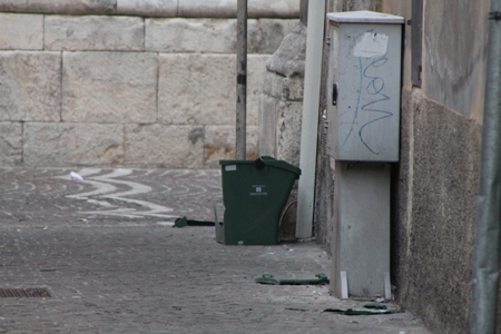 mastello smembrato14 GENNAIO 2014 – C’è una brutta fine anche per i mastelli della differenziata: forse l’auto guidata da una persona disattenta; forse la foga devastatrice di chi anima le notti sulmonesi, la stessa persona che ha divelto una pianta che se ne stava tranquilla in uno dei vasi messi apposta per abbellire l’arredo urbano.
