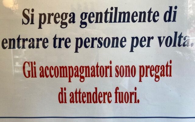 14 GIUGNO 2021 – Non tutti hanno prontezza di riflessi e così qualcuno rimane perplesso davanti al cartello anti-assembramento. Quindi, stando da solo, aspetta altri due acquirenti, in modo che si possa entrare in tre. E gli accompagnatori, dal canto loro, si irrigidiscono perchè se “attendono fuori” non accompagnano più e rimangono senza qualifica, addirittura qualcuno senza identità, nel non accompagnare.
