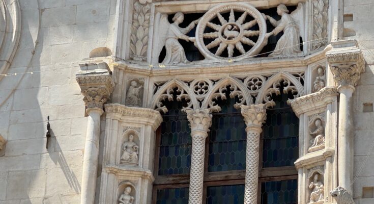 Quella che vediamo in foto è la trifora del Palazzo dell’Annunziata, una delle poche in Abruzzo e la più bella secondo il direttore del “Corriere della Sera” dal 1926 al 1927, Ugo Ojetti, che definì tutte le finestre dell'”Annunziata” le “più belle del Quattrocento”. E’ attraversata da fili elettrici. Nell’era della tecnologia non si è trovato modo migliore di trasferire l’energia degli elettroni.