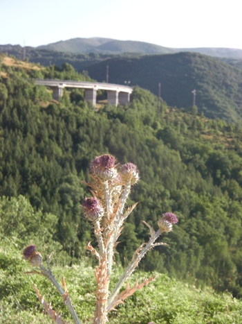 Nella foto in basso il cardo è ripreso con lo sfondo di uno dei tanti viadotti e sembra richiamare quelle righe del grande scrittore e giornalista: “Sopra  il fondo, tendente al grigio, splende il fiore abruzzese, il cardo, bianco argentato, o d’un azzurro fosforico così carino che sembra prodotto da una tintura artificiale. Quei fiori si ritrovano come ornamento nelle case, dove resistono stagioni intere senza stingersi. Il grigio, l’argenteo, il violaceo sono i colori dominanti di questo paesaggio liturgico”. Piovene l’ha descritto accanto agli “altipiani più suggestivi”, centro “non soltanto fisico della catena che percorre l’Italia”. “Così il turismo è penetrato nel piano delle Cinque Miglia, ma l’ha lasciato quasi intatto. I monti lo chiudono da ogni parte, valli solitarie si internano da ambo i lati verso le nuvole; vi camminano greggi, armenti, uomini a cavallo; vi luccica qualche covone. I turisti di Roccaraso e di Rivisondoli rimangono occasionali in un paesaggio senza tempo. Tutto intorno è la plaga abruzzese più bella, dominata da rocce grigiastre, o d’un grigio violaceo: con i dossi rotondi coperti di un’erba dorata lucida;  solcata di montagne lunghe che hanno la forma di elefanti accosciati”.