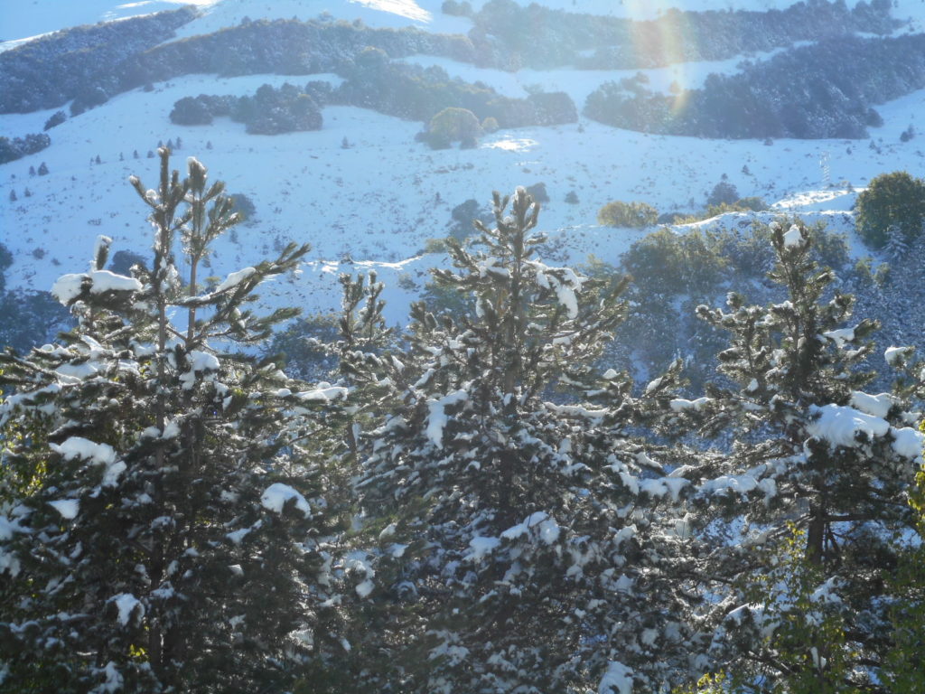 I pini lungo la SS 17 in una giornata di sole dopo una bufera