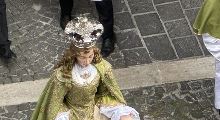 21 APRILE 2025 – C’è un’opera demolitrice dei riti pasquali a Sulmona e non è di oggi. La fretta con la quale si è disposto il rientro della processione del Cristo Morto ha cominciato a segnare questo trend. I riti medievali della Passione nel triduo erano un incontro con le tenebre, per meglio distinguerle dalla luminosità della Resurrezione. Si inoltravano nelle ore antelucane, paralleli com’erano all’angoscia dello smarrimento. E, quindi, andavano ben oltre la mezzanotte. Qualche anno prima era stata allestita una specie di processione nel pomeriggio del giovedì, che non riprendeva da quella necessaria ad accompagnare la statua dalla Tomba in vista della Pasqua, del sabato pomeriggio. Tutto mirava ad un decentramento dei colossi del venerdì e della domenica. Poi gli spari non si fanno più. Ieri mattina, paziente e con il fiore in mano, la Madonna, sebbene incoronata (nella foto), ha aspettato poco prima dell’incrocio tra Via Solimo e il Corso, che le avanguardie si scambiassero i cenni per far in modo che il fracasso della musica davanti all’Annunziata non coprisse la mite marcetta della banda della processione. Così: quasi questuante in attesa di una udienza con Trump.