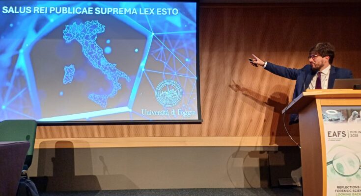 31 maggio 2025 – La conferenza è in inglese, ma un po’ più giù e a ovest del mitico Vallo di Adriano si continua ad usare concetti in latino quando si parla di diritto. L’immagine è ripresa dal convegno dell’Accademia europea di scienze forensi (“EAFS – European Academy of Forensic Science). “Salus rei publicae suprema lex esto” domina sulla slide (ops…: “imago“, avrebbe detto Ovidio) che il prof. avv. Guido Colaiacovo, docente di Diritto e procedura penale a Foggia, illustra ai giuristi convenuti a Dublino nella settimana che si conclude.