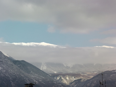 Molto più complesso è il tragitto che segue il torrente Vella, cioè accanto alla strada statale da Pacentro a Passo San Leonardo, sebbene siano stati avvistati anche lì i lupi presumibilmente dimoranti tra il Guado di Coccia e Passo San Leonardo (nell’altra foto, una suggestiva inquadratura della  cresta della Majella, bianco al di sopra delle nuvole).