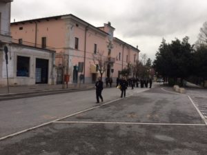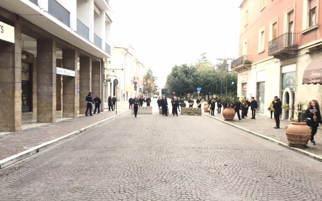 I APRILE 2018 – E’ difficile conservare un rito religioso medievale: ma non tanto per la crisi della fede, quanto per le misure anti-terrorismo, che si risolvono esattamente in quel cambiamento delle abitudini di vita che i soliti cialtroni escludono ogni volta che c’è un attentato, per non riconoscere che l’Occidente è andato a portare la guerra nei territori da conquistare alle ragioni del petrolio. I terroristi hanno cambiato la vita dell’Occidente, che si voglia riconoscerlo o non; e stamane una cerimonia gioiosa, l’unica in tutto l’anno, una occasione di incontro diverso dalla “piazza di facebook” si sta risolvendo in una artificiosa messa in scena di quella che fu una volta la Pasqua sulmonese, piena di colori e di saluti, di suoni diversi sin dalle prime ore della mattina. Una pantomima del corteo della banda che sveglia la città appare la sonatina delle note allegre (e in questo contesto più aliene) sotto il Vescovado, appena un’ora prima che i varchi per entrare in Piazza Garibaldi si ridurranno a tre, cioè in pratica si intaseranno al punto da lasciare i più fuori del teatro della grande corsa della speranza verso la resurrezione.