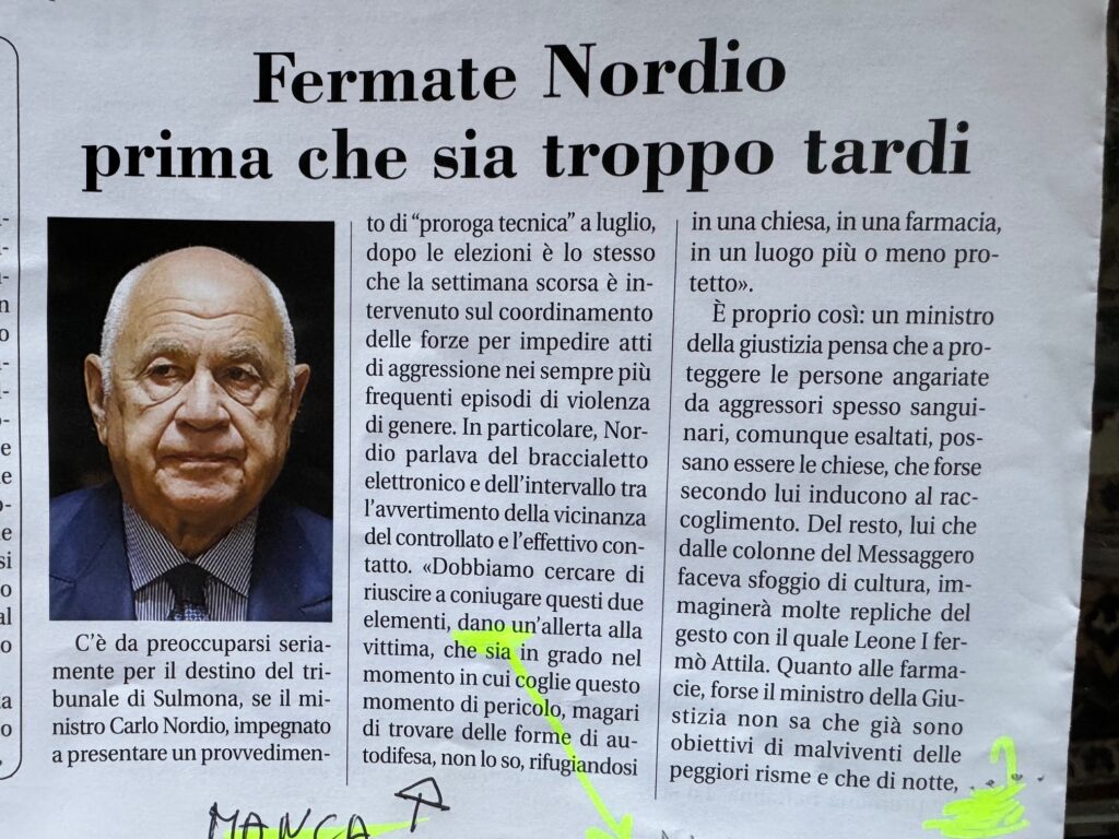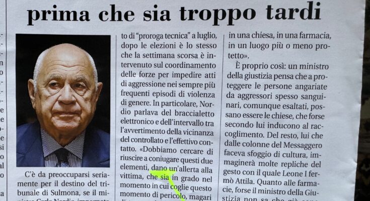 22 MAGGIO 2025 – Carlo Nordio, detto anche ministro della Giustizia, spara scempiaggini a tutto spiano sulle violenze di genere e pensa di convincere le donne di trovare rifugio da stalker e violentatori in “qualche chiesa, che so, o farmacia” nel tempo intercorrente dal segnale del braccialetto elettronico e l’arrivo di polizia o carabinieri. Fa ridere tutta l’Italia, ma il guaio è che il Centro Destra a Sulmona vuol convincere gli elettori che l’annuncio del “ministro” per un disegno di legge a luglio onde salvare il tribunale sia attendibile. Sì, sì..