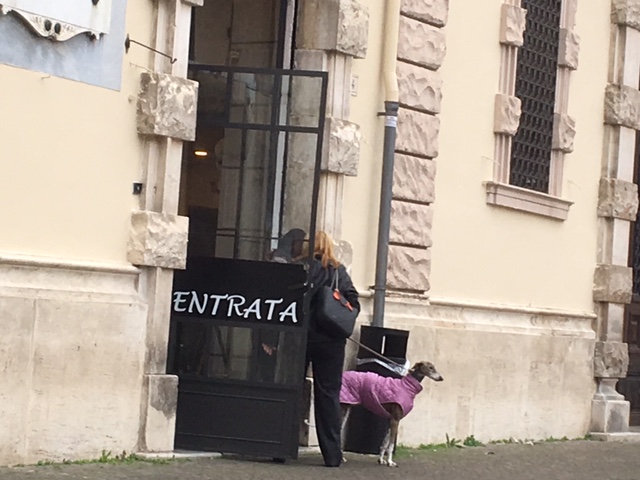 Quando l’abbiamo visto uscire tre secondi dopo che era entrato, abbiamo chiesto alla padrona se per caso fossero stati i gestori a non consentire l’accesso ai cani, in deroga all’esempio di tolleranza che consentiva al dalmata Gaspare di entrare come un fulmine, afferrare al volo una brioche che gli lanciava la cameriera e tornare fuori a mangiarsela, sotto gli occhi divertiti del prof. Carlo Autiero. Invece, non è questione di divieti. A otto anni, questo bell’esemplare di cane dignitoso, strappato al destino di altri cani da corsa, si può permettere pure di coltivare un suo gusto in fatto di cinema e di politica e soprattutto può evitare che l’una sia la chiave di lettura del primo. Per un raffinato come lui l’estetica è fine a se stessa e, al contrario di quello che diceva il Duce “Il cinema non è l’arma più potente”.