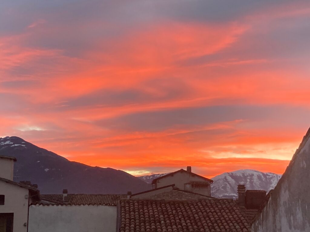 19 DICEMBRE 2021 – Continuano a fallire le previsioni meteorologiche del web e tocca affidarsi alla scienza degli avi, sprovvisti di smartphone. Ieri e oggi Sulmona (almeno fino a cinque o sei giorni fa) sarebbe stata al centro di bufere e piogge ghiacciate, con temperature di molto sotto lo zero. Dato il rosso di sera del 12 dicembre (nella foto in basso) qualche dubbio ci tormentava. E infatti giornate di sole più bello di ieri e ieri l’altro non ricordavamo da vari natali fa. Simmetricamente, dobbiamo credere alle pecorelle radunate stamane alle 8 sul cielo della Valle Peligna. Così conquisteremo l’immunità alle previsioni del web.