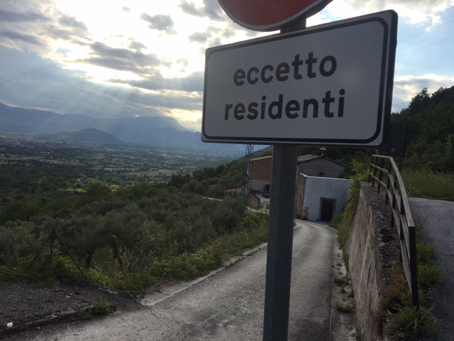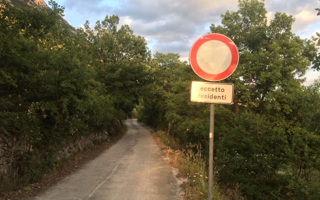 2 GIUGNO 2020 – Una strada quasi tutta asfaltata collega il punto oltre il quale non si può percorrere l’ex provinciale Sulmona-Pacentro per una frana e l’ingresso a Pacentro. Ai due imbocchi di questa stradina altrettanti cartelli con il divieto di transito sono accompagnati dalla prescrizione “eccetto residenti”. Cosa si intendano per “residenti” è un po’ difficile stabilirlo, perché si incontrano solo due abitazioni. E poi, se solo i residenti possono percorrerla, tutti quelli che coltivano i ridenti uliveti non sarebbero esclusi dal divieto. I cartelli della segnaletica stradale eccettuano i residenti; non i ridenti (uliveti). E non sarebbero esclusi neppure i pastori che transitano con gli armenti. Proprio perché erranti, gli armenti non sono residenti e i cartelli escludono dal divieto i residenti, ma non “gli armenti”.