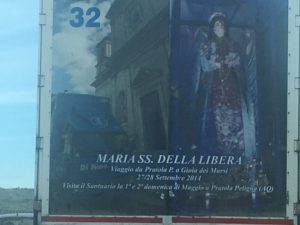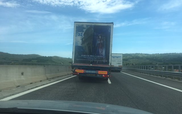 8 MAGGIO 2019 – C’è un fervore incalzante per gli esempi di devozione anche molto scenografica a favore della Madonna della Libera, dopo la festa di venerdì, sabato e domenica scorsa (anche con la riapertura del Santuario a Pratola Peligna) e in vista dell’Ottavario di sabato e domenica prossimi. L’immagine è stata riprodotta su un TIR, che ieri sfrecciava sulla A25 poco dopo Torre de’Passeri in un sorpasso su un altro TIR. Ottimo esempio di come i pratolani abbiano voluto superare i sulmonesi con la loro “Madonna che scappa in piazza”, allestendo una “Madonna che scappa in autostrada”.