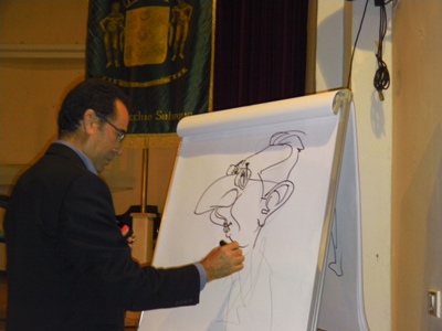 13 OTTOBRE 2012 – “Alla fine ho abbracciato l’impressionismo. Perchè? vi fanno poca impressione tutti quelli che stanno in queste caricature?” Ripercorrendo il suo passato recente e remoto, Mario Marcello Maiorano (tre emme, appunto) ha ricordato del continuo impeto di riempire comunque i fogli di carta che gli capitavano a tiro, ma anche della curiosità per i disegnatori della sua infanzia, della serietà del primo approccio con l’arte, del “fuoco sacro” di imparare la tecnica, insomma di un piccolo sogno curato e valorizzato, che ancora oggi lo tiene inchiodato per intere giornate alla scrivania. (Nella foto del titolo il dott. Maiorano disegna Cossiga durante l’incontro nella sala Grannonio a Castelvecchio Subequo)