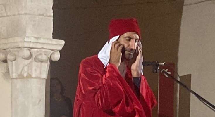 10 LUGLIO 2022 – Mentre recitava il terzo canto del “Purgatorio”, nella serata organizzata dal Fondo per l’Ambiente Italiano su Manfredi di Svevia, Pierluigi Di Clemente ha dovuto proteggersi le orecchie per concentrarsi, tale era il rumore proveniente dalla cena di borgo “Bonomini”.
