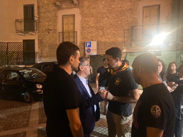 Il sindaco Di Piero mentre invita il capitano di “Bonomini” a contenere il volume delle musiche. Di lì a poco il chiasso inonderà di nuovo il cortile dell’Annunziata